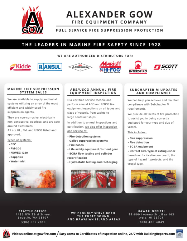 Established in 1928, Alexander Gow Fire Equipment Company has been serving the fire protection needs of the Pacific Northwest for over 80 years. We provide fire safety equipment, design, maintenance and inspection for all your commercial and marine needs. Our company is dedicated to providing the finest in fire protection detection equipment and services to our valued customers. Contact us today with all your fire protection product and service questions.