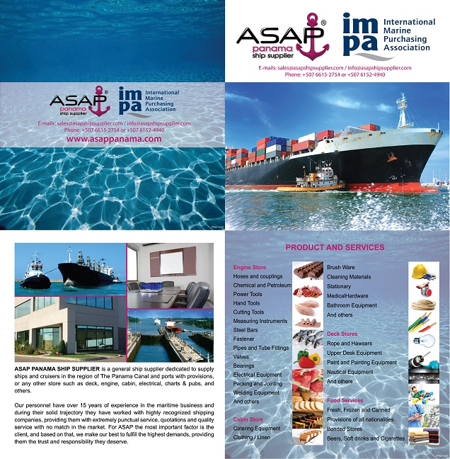 Our company ASAP PANAMA SHIP SUPPLIER provides the full range of ship supplies that your vessel may need at the republic of Panama on all major ports in the Atlantic and Pacific side, from provisions to technical stores including everything (Deck, Cabin, Engine, Medicines, Charts & Pubs, Stationary, and others). Beside supplies we may also assist you with spares delivery.