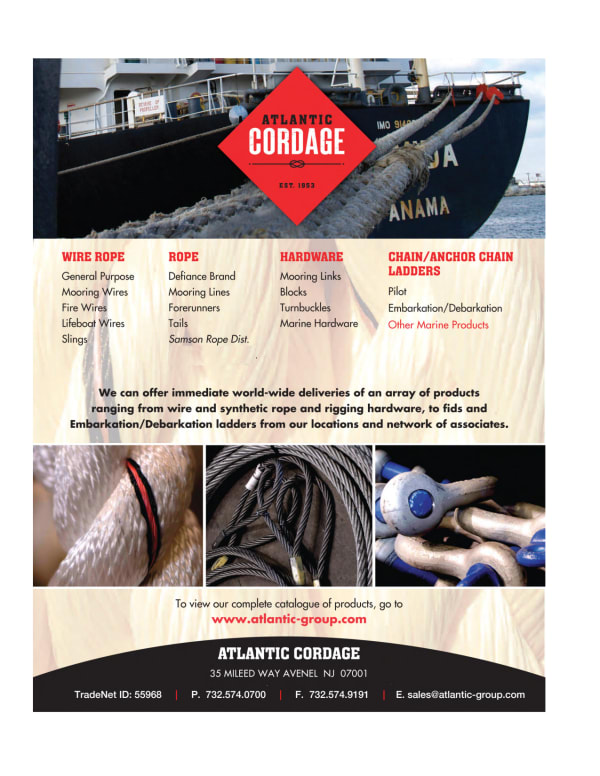 We offer a solution with DEFIANCE Wire Rope, Fiber Ropes and Hardware, A.L. Don ladders...quality-consistent products that meet or exceed current specifications including but not limited to RRW-410-G, API-9A. Cordage Institute Specifications, OCIMF, SOLAS, IMO etc. relating to a broad spectrum of features aimed to ensure Quality, Reliability and Satisfaction to our customer. This is what differentiates Atlantic Cordage from its competition. DEFIANCE products are precision engineered and manufactured to assure withstanding of severe marine field applications. Close control over every phase of our operations is second to none. This excellence is not only achieved by having the product available when you need it, but by also providing a knowledgeable staff fully trained in the industry we excel in. A. L. Don manufactures a complete line of Pilot rope ladders and Embarkation/Debarkation rope ladders featuring wood and/or synthetic steps. Our ladders meet and exceed all of the newest International and SOLAS standards with many having the same patented design as found in our U. S. Coast Guard Approved Ladders which have in-place replaceable steps. Unlike many other SOLAS ladders, our SOLAS-MAX Pilot and Debarkation ladders make use of a patented clamp design which allows the steps to be replaced quickly and easily right on board without unstringing the ladder or the need for any special tools. Our SOLAS-MAX Pilot ladder complies with the newest SOLAS Regulations and IMO Standards Reg. V/23 and ISO 799:2004 which came into effect July 1, 2012 available with ABS Product Development Assessment. Since 1949, our standards are as high as yours. A. L. Don Co. is an integral part of the Atlantic Cordage Group. Atlantic Cordage carries an extensive inventory of wire rope, towing hawsers, synthetic and manila rope, ATB Pin Lubricant (VGP approved), A.L. Don Embarkation/Debarkation ladders, marine and rigging hardware, chain and anchor chain and web sling products. Our main 40,000 square foot location provides a complete rigging shop to handle your every splicing need from basic wire rope slings to mooring lines. Our own fleet of trucks stand ready to deliver custom work in a matter of hours within our own delivery area. Our expediting department assures prompt service a to all other parts of the country. We want to be your one reliable source to fill your needs. With our network of associates, we can offer immediate world-wide deliveries of our products.