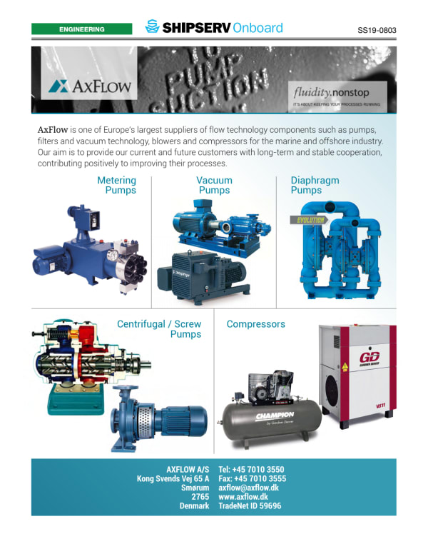 AxFlow is Europe's leading supplier of positive displacement pumps for process industries AxFlow Group operates in industries where processes and pump solutions must always operate and where downtime is expensive and unacceptable. AxFlow A / S is a 100% subsidiary of the European AxFlow group that is represented with own subsidiaries in 20 European countries. AxFlow Group is Europe's leading provider of flow technology components. This market position, we intend to keep by continually offering our customers quality products combined with a high degree of service. AxFlow Group was founded in 1989 and since then we have worked diligently to meet the European process industry needs. We represent the world's leading manufacturers of flow technical equipment and strive constantly to develop our organization with people who possess great skills and meet the requirements you, the customer is entitled to expect of us as a serious and professional supplier and partner. Our goal is to meet local industry needs, while we utilize our organizational strength to create strategic distribution and service solutions throughout Europe. MISSION AxFlow delivers the best overall solutions for fluid handling of Danish industry. We perform the mission as follows: By combining the approach to the best suppliers with outstanding advice and service, we contribute to improved reliability and performance for our customers. VISION AxFlow is the customers' preferred choice as a supplier of flow technical solutions for fluid handling from industry leading suppliers. AxFlow has remarkably high customer - and employee satisfaction.