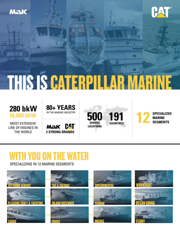 The industry's largest range of engines provides the reliability you need. Caterpillar Marine ensures that you have an engine on board that will work as hard as you do. Select from our wide range of Commercial Propulsion Engines, High Performance Propulsion Engines, Marine Generators, and Auxiliary Engines.