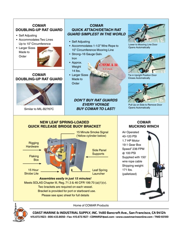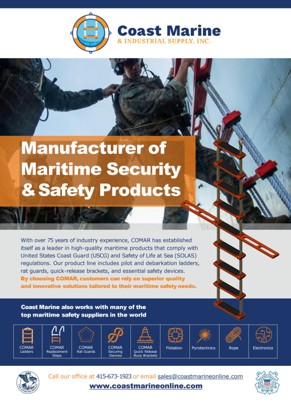 Celebrating 80 years of industry experience, COMAR has established itself as a leader in high-quality maritime products that comply with United States Coast Guard (USCG) and Safety of Life at Sea (SOLAS) regulations. Our product line includes pilot and debarkation ladders, rat guards, quick-release brackets, and essential safety devices. By choosing COMAR, customers can rely on superior quality and innovative solutions tailored to their maritime safety needs. Sole manufacturer of all COMAR Products: Pilot, Debarkation, and Work Boat Ladders, Rat Guards, and Quick Release Ring Buoy Brackets. Established in 1946. Ships across the country and internationally. Please reach out to sales@coastmarineonline or call (415) 673-1923 for inquiries