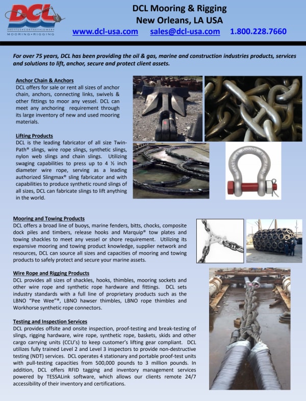 DCL Mooring & Rigging is a recognized leader in supplying a variety of lifting, mooring, inspection products, and services to domestic and international customers in the marine, aquaculture, offshore wind, construction, industrial, and oil & gas industries. Based in New Orleans, LA, the company has been meeting the needs of customers for over 70 years. Products and Services > DCL fabricates all sizes of wire and synthetic rope slings for heavy lift applications. With wire rope swage capabilities up to 4 ½ inch sleeve diameter, serving as an authorized Slingmax-Twinpath fabricator and with complete round and nylon sling fabrication in-house, DCL can meet any lift requirement. > DCL provides onsite and offsite inspection and proof-testing of wire rope, slings and hardware. These services are supported by inventory management, RFID tagging, NDT services & warehousing capabilities to manage your rigging assets and to keep you compliant. Utilizing stationary and portable proof testing capabilities up to 3 million pounds and basket testing up to 120,000 pounds all supported by level 3 trained inspectors, DCL provides complete inspection and testing services. > DCL offers a broad line of anchors, anchor chain, links, swivels & fittings to meet any vessel or shore mooring requirement. Product lines include all sizes of anchors, anchor chain, wire rope, hardware, deck & dock fittings, buoys, fenders, river ratchets, galley equipment and testing services. DCL has the expertise and products to secure the simplest thru the most complex mooring requirement. > DCL provides all size wire and synthetic rope hardware and fittings. In addition to distributing its own product lines such as LBNO fittings, PeeWee sockets and its new line of synthetic rope connectors, the company sources product from international and domestic manufacturers and represents numerous suppliers and manufacturers worldwide including Crosby. DCL can meet any rigging requirement. Call for information on Synthetic Rope Sockets and Synthetic Rope Terminations.