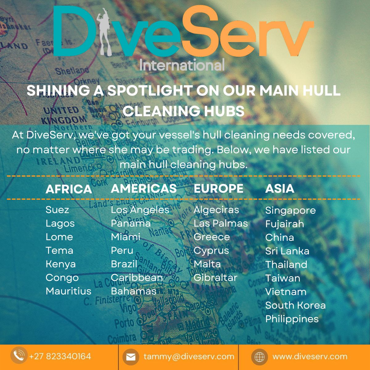 DiveServ - Your Partner for Comprehensive Underwater Services With over two decades of unwavering commitment in the commercial diving industry, DiveServ offers an extensive array of underwater services tailored to the diverse requirements of the maritime sector. Our global reach allows us to provide comprehensive underwater solutions in all major ports across the world, facilitated by our network of highly specialized and safety-conscious dive teams. Our primary objective revolves around the delivery of efficient and cost-effective underwater services to ship owners and managers. Whether it entails hull inspections, hull cleaning, propeller polishing, routine maintenance, or intricate repair and welding tasks, DiveServ is ready to meet your every underwater need. We are determined in our dedication to achieving excellence in every underwater solution, ensuring the continued performance of your vessels while adhering to international safety standards. Our aim is to provide efficient, high-quality services, establishing us as your trusted partner for all your underwater service requirements within the maritime industry across the globe. Our core service offerings span a comprehensive spectrum of underwater solutions, including: Hull Cleanings: Ensuring vessel efficiency through thorough cleaning. Propeller Polishing: Maximizing Propulsion Efficiency to Its Peak. Underwater Surveys and Inspections: In-depth examinations to safeguard vessel integrity. Underwater Maintenance and Repairs: Prompt and skillful handling of repair work. Niche Cleaning for Bio-Fouling Compliance: Specialized cleaning to adhere to environmental regulations. These services, among others, are available not only in major ports worldwide but also in various locations. DiveServ takes immense pride in offering a complete range of underwater solutions to cater to the multifaceted needs of the maritime industry. Feel free to contact us today to explore how we can help maintain a high-performing fleet.