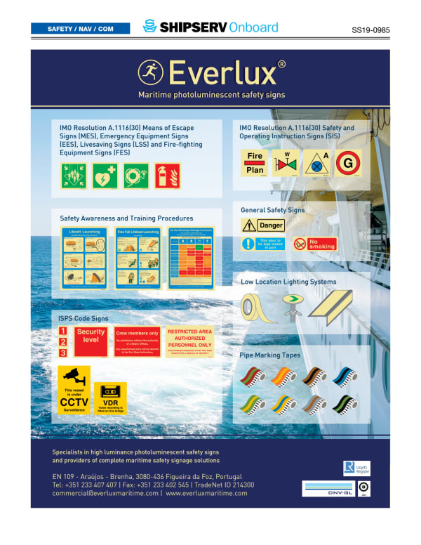About Everlux Everlux specializes in the research, development, production, and sale of photoluminescent safety signs. Everlux offers comprehensive safety signage solutions for the maritime industry that are compliant with IMO Resolutions, the SOLAS Convention, and ISO standards. Products and Services Everlux photoluminescent maritime safety signs catalogue enables ship chandlers, ship suppliers, shipbuilders, owners and operators, as well as their safety officers and purchasing managers, to quickly understand the technicalities of safety signage systems design and installation. This ensures compliance with the most updated standards and provides a highly safe environment for crews and passengers. Everlux Product Range Includes: • IMO signs • Photoluminescent Low Location Lighting system • Signs compliant with ISO 7010: 2011 and ISO 3864: 2011 • Signs for dangerous goods as per IMDG Code specifications • Water safety signs • Signage solutions for pipe content identification according to ISO 14726: 2008 (color-coded tapes) • Safety procedure instructions as required by the ISM Code (safety posters) • Photoluminescent marking rolls In addition to a vast product range, Everlux offers a photoluminescent Low Location Lighting system measurement service. With DNV approval as a service supplier, Everlux technicians are available to provide this onboard service worldwide. Quality Certifications: • Lloyd’s Register Type Approval • MED Certification • DNV Service Suppliers Approval • EN NP ISO 9001:2008 Global Distribution Everlux products are available in major international ports through a selected list of distributors. Please contact the Everlux team for information on authorized distributors at your port of call. Distribution Opportunities As Everlux aim to expand global coverage, distribution opportunities for ship-supplying companies can be offered. Please the Everlux team to receive marketing materials and terms and conditions. For more information, visit the Everlux website: www.everluxmaritime.com www.everluxmaritime.com