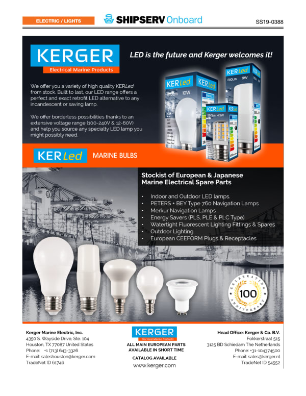 For over 100 years Kerger has been the preeminent supplier of European, Japanese and American marine electrical parts and supplies. From our warehouses in Rotterdam and Houston, Kerger carries a large stock and extensive variety of the highest quality electrical parts and supplies made by leading manufacturers, such as Philips, Telemecanique, and Danfoss and navigation fixtures made by Peters & Bey. This allows us to supply what our clients need, where they need it, and when they need it. Our team of knowledgeable sales people have many years’ experience in the complex marine supply business and are fully informed on international shipping requirements. We pride ourselves on knowing our clients personally and serving them professionally and efficiently. Our Dutch office is located close to the Port of Rotterdam. Deliveries from our Rotterdam office are fast and reliable because they are made by our own in-house delivery team. Orders with destinations abroad are generally shipped out the same day orders are received and are shipped through our regular distribution channels. The Kerger warehouse in Houston is fully stocked and orders can be delivered to any location in the US, Canada, Mexico and Puerto Rico on short notice. We are proud to list in our 100 year-celebration-catalog our new line of KERLed lamps and additional indoor and outdoor lighting. Our catalog can be obtained at our website www.kerger.com.