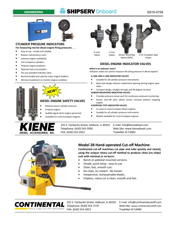Kiene Diesel manufactures three products related to diesel engine cylinder pressures. Cylinder Pressure Indicators: The K-Series peak pressure indicator is a rugged, easy to use instrument for measuring the peak pressure of diesel engines. - Kiene’s indicator valves provide access to the engine combustion chamber to allow instruments (including the K-Series indicators) to measure cylinder pressures during engine operation. - Kiene now also manufactures diesel engine safety valves for most European Diesels. These valves vent excess pressure in the event of a cylinder over-pressure event. - Kiene Diesel Accessories is a manufacturing company located in the Chicago, Illinois, USA area. All Kiene products are manufactured at this modern, up-to-date facility.