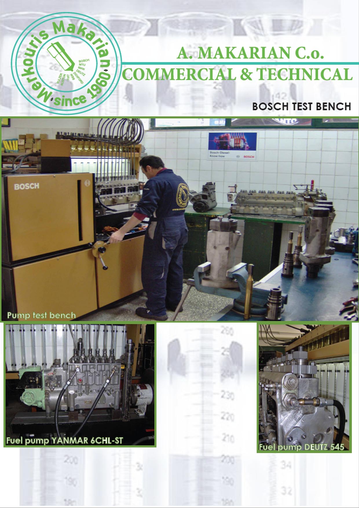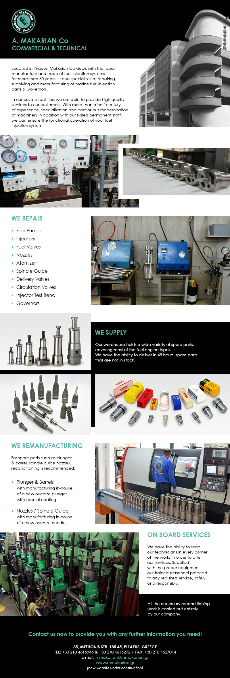 The company was founded in 1960 by Merkourio Makarian.Deals with the repair, manufacture and trade of fuel injection systems (pumps&injectors). At the private facilities of 1500m2 which are located at 85-87 Methonis Str.Piraeus,we provide high quality services by understanding the urgent needs of our customers and in order to keep their own income stream.More from half century of experience,specialization and continuous modernization of machinery and permanent staff,it ensures you the right operation of fuel injection system.The fuel is about 70% of the operating costs of large diesel engines. Fuel consumption and proper functioning of these engines are particularly dependent on the good operation of the fuel injection systems,for precise delivery of the correct amount of fuel at the right time.The bad condition or adjustment of pumps&injectors can lead to greatly increased fuel costs,reduces the life of the engines and has over the limit exhaust emissions. We are professional for repair, supply and manufacture of marine fuel injection parts & Governors. • FUEL PUMPS • INJECTORS • FUEL VALVES • NOZZLES • PLUNGER & BARREL • PUMP ELEMENT • ATOMIZER • SPINDLE GUIDE • DELIVERY VALVE • CIRCULATION VALVES • TEST BENCH • GOVERNORS • BOSCH BATTERIES Also we have the biggest stock of spares parts at marine fuel injection equipments in Greece.