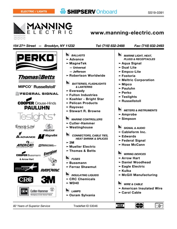 Manning Electric has specialized in marine electrical supplies since 1937. The keys to our longevity have been: A Strong and Loyal Customer Base First Class Distributorships A sales force with a minimum of 10 years experience The ability to not only supply electrical almost any marine related item. Continuing our dedication to the Marine industry. Manning Supply our Woman owned Hubzone sister company was establish 2006. 3M Advance Transformer American Insulated Wire Amprobe Aqua Signal Carlisle & Finch Cableform Cooper Bussman Cooper Wiring Device CRC Industries Cutler Hammer Daniel Woodhead Duracell Edwards Signal Empco-Lite Eveready Federal Signal Ferraz Shawmut Fostoria Fulton Industries Hose McCann Julian A. McDermott Corporation Koehler Bright Star McGill Meltric MIPCO Mueller ORECK Osram-Sylvania Panduit Pauluhn Pelican PERKO Phoenix RAYOVAC Robertson Russelstoll Simpson Stewart R. Browne Thomas & Betts Universal WD-40 Westinghouse