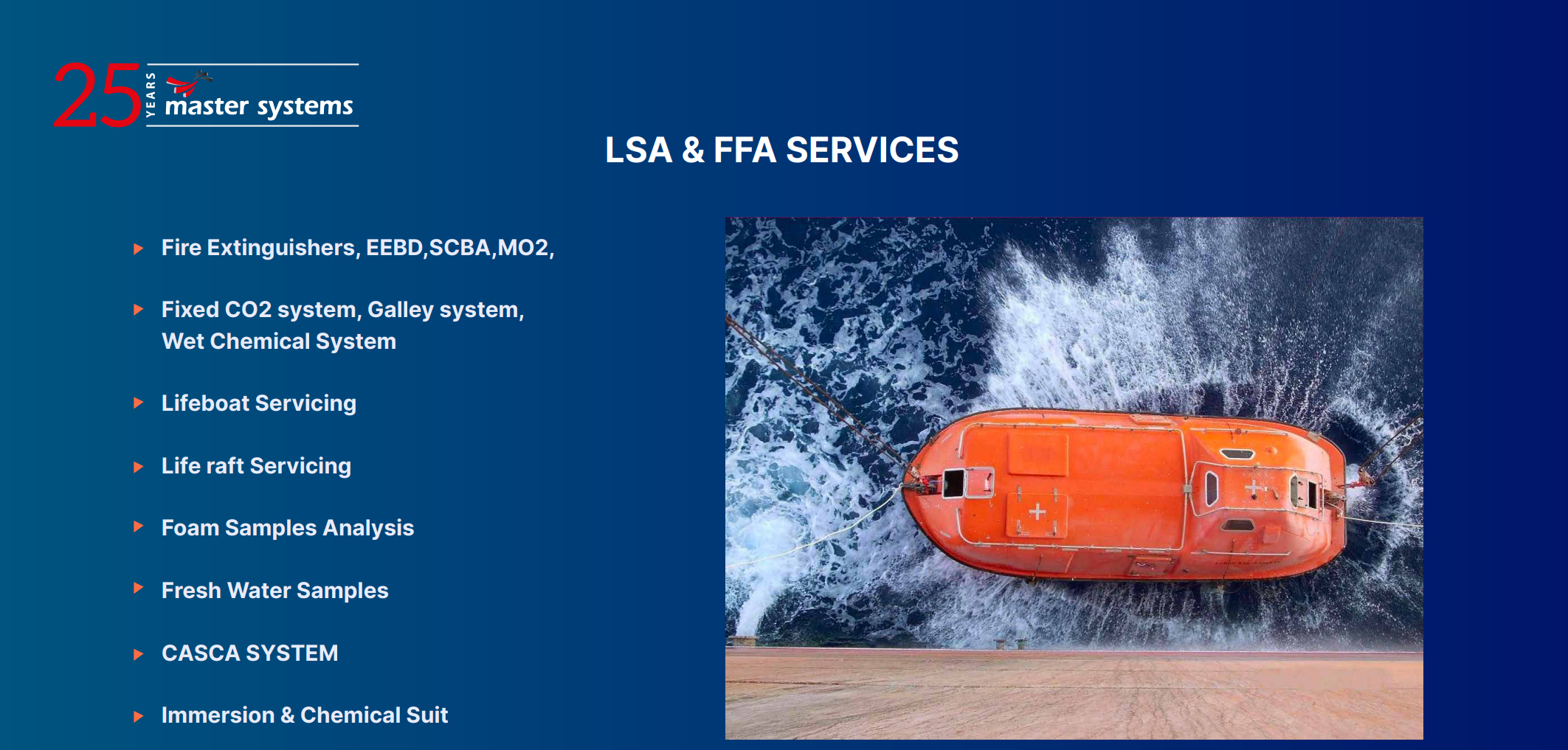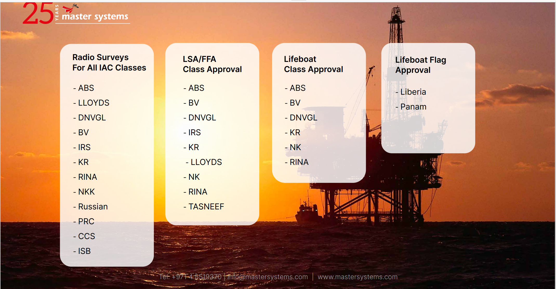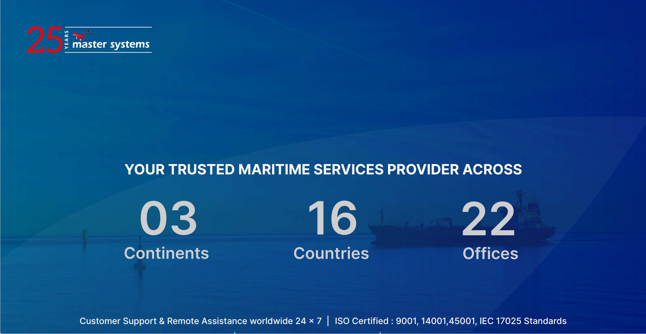 Contact Person- Aleena Johnson Position-Global Sales Head Contact number- +61452643369/+971526935282 Email ID - aleena@mastersystems.com We Master Systems is a renowned marine service provider that offers a comprehensive range of services, supplies, repairs, and installations in the fields of Communication, Navigation, Automation, Safety (LSA & FFA), and Calibration. We pride ourselves on being able to cater to the diverse maritime needs of our clients worldwide. Our Advantages : • We have local office in all the below geographical areas and our engineers. • This can reduce the turnaround time of attendance and enable world-wide service support. • We make sure we provide best and quality service as per your requirement . We look forward for a long-term relationship , please advise if we can support us and meet to discuss . Company overview – Marine. As of now this is year is our 25th YEAR, we hold 22 offices spread across the globe and four divisions. We now specialize Marine , Automation, Electrical , NAVCOM, Safety and Calibration for Maritime industry. All our offices are independent in terms of employees, spares, and financials. We today have a client base of 3500+ clients spread across the globe. To meet the requirements of customers, we do have a team of 500+ employees working across our offices. We do have partnership with major manufactures from the Maritime industry for -RADIO SURVEY,VDR,GYRO,RADAR,MAGNETIC COMPASS,MF/HF,VSAT,STARLINK,VESSEL IT ,VHF,UHF,BNWAS,SPEED LOG,ECHO SOUNDER,AUTOPILOT,FIRE ALRAM,MULTIGAS DETECTOR,OWS,ODME,UTI,BWTS,BWMS,PA SYSTEM,ELECTRICAL,BOILER,IGG,MGPS,ANODE,DIGITALIZATION,LIFERFAT,CASCADE SYSTEMS,FOAM SAMPLE ANALYSIS,WATER SAMPLE ANALYSIA,EEBD,FIRE EXTINGUISHERS,CO2 SYSTEM,LIFEBOAT,DAVIT AND WINCH for more details you can visit our website www.mastersystems.com Additionally, I would like to highlight that we are affiliated with all major agencies and classification societies, and possess over 15 VDR approvals, including reputable brands such as JRC, FURUNO, DANELEC, RUTTER, INTERSCHALT,HYUNDAI etc. Geography and Skillsets. Globalization has been in the forefront our expansion agenda and have been rapidly establishing offices across the globe. Our current operational offices are as below. 1. UAE – Abu Dhabi, Dubai, Sharjah, Fujairah & Ajman 2. Qatar 3. Bahrain 4. Saudi Arabia 5. Singapore 6. India – Mumbai & Cochin 7. Ghana 8. Egypt 9. Oman 10. Namibia-Angola 11. Nigeria 12. Lomé 13. Malaysia 14. Australia 15. Korea 16. Netherlands 17. Spain 18. Indonesia 19. China 20. Turkey We sincerely appreciate your prompt response and assure you that the discussion will not take up much of your time. We look forward to hearing from you and exploring the potential collaboration between our organizations. Thank you for your attention to this matter.