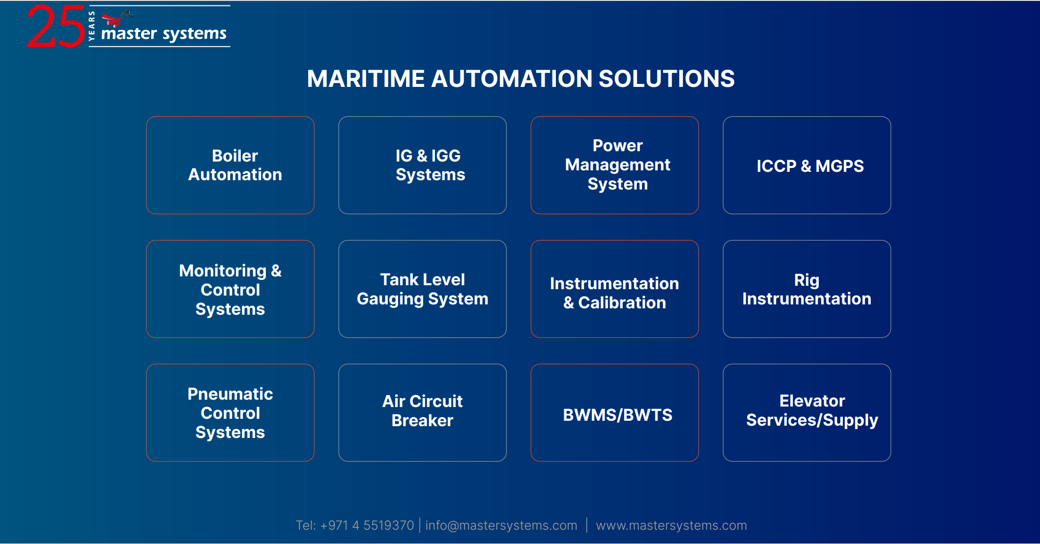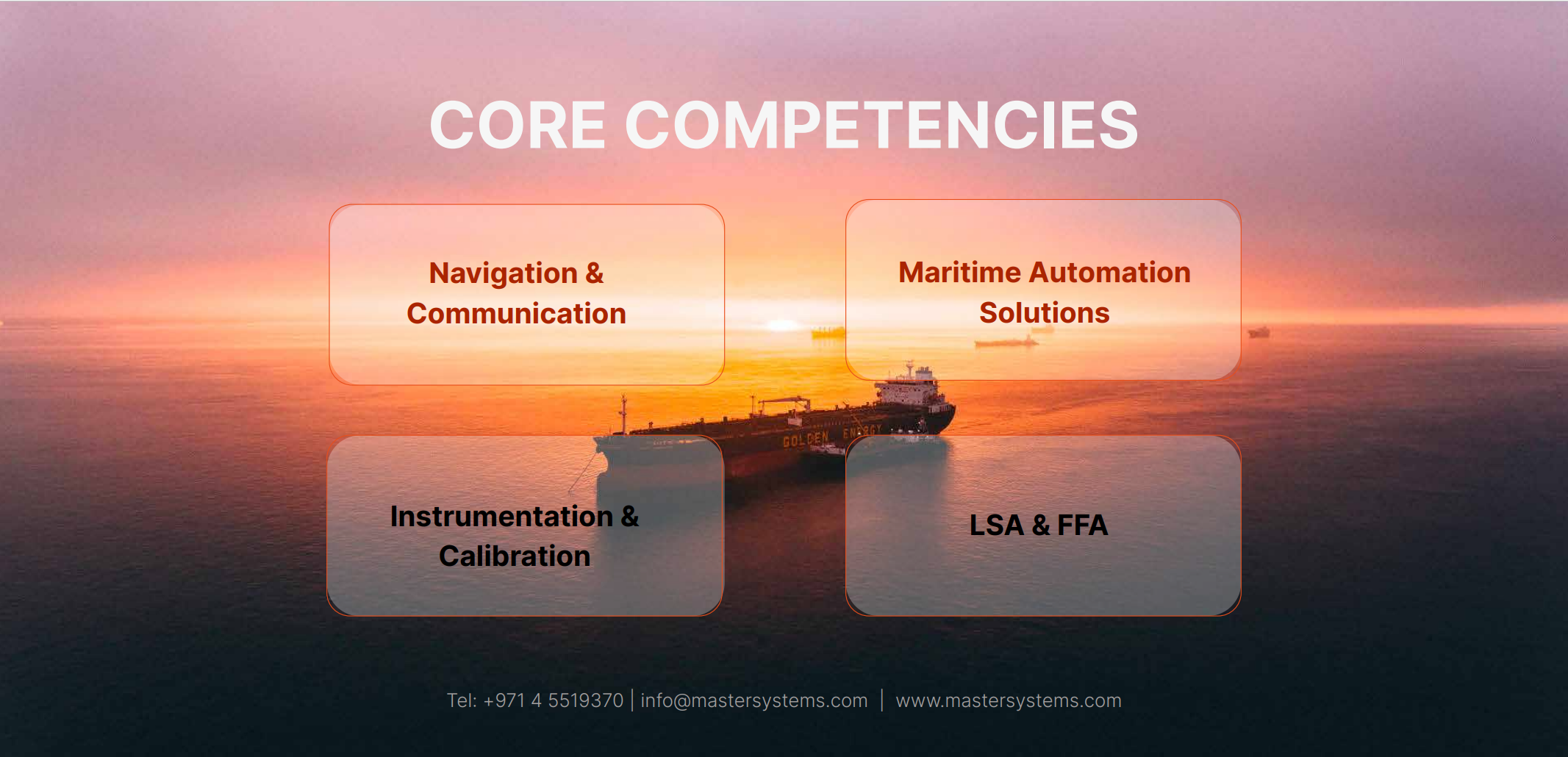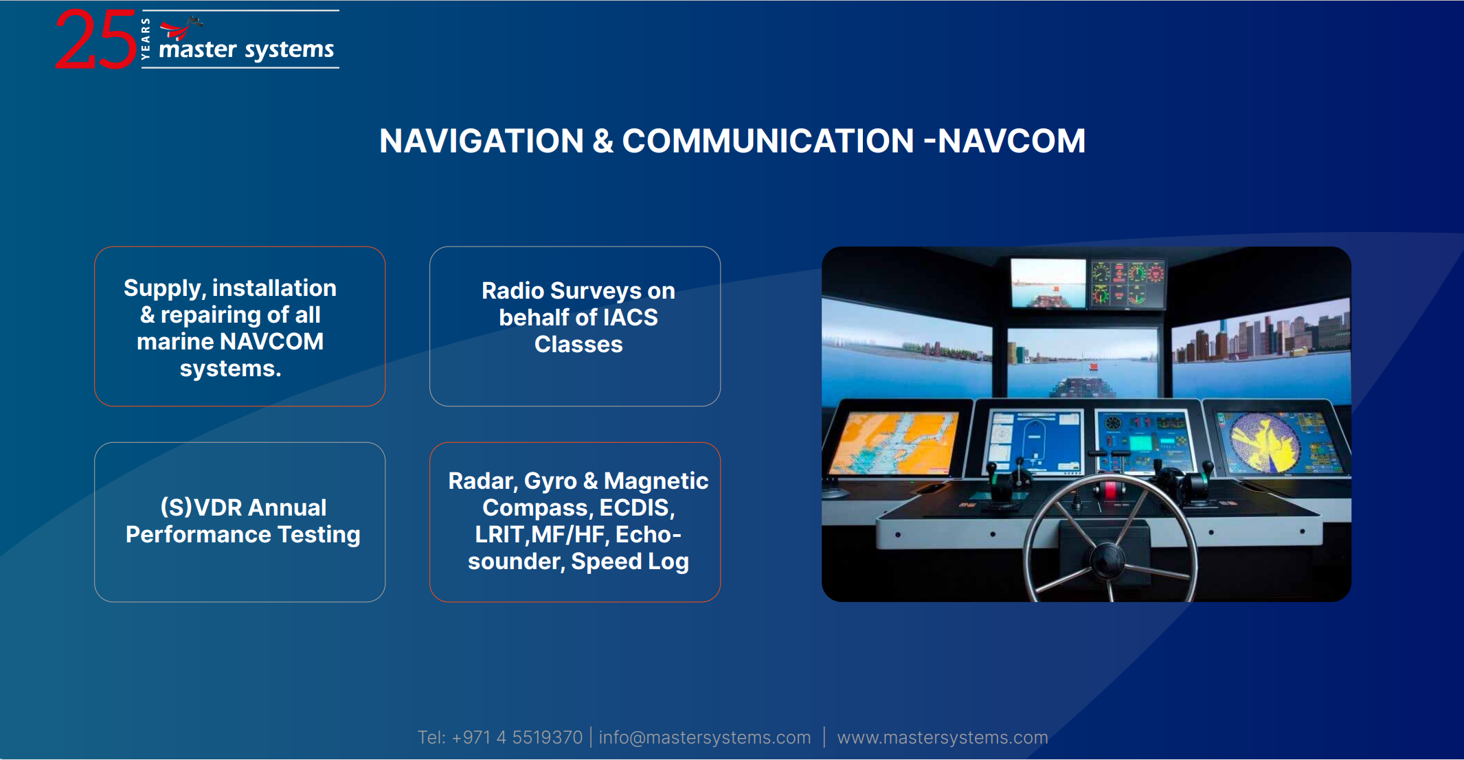 Contact Person- Aleena Johnson Position-Global Sales Head Contact number- +61452643369/+971526935282 Email ID - aleena@mastersystems.com We Master Systems is a renowned marine service provider that offers a comprehensive range of services, supplies, repairs, and installations in the fields of Communication, Navigation, Automation, Safety (LSA & FFA), and Calibration. We pride ourselves on being able to cater to the diverse maritime needs of our clients worldwide. Our Advantages : • We have local office in all the below geographical areas and our engineers. • This can reduce the turnaround time of attendance and enable world-wide service support. • We make sure we provide best and quality service as per your requirement . We look forward for a long-term relationship , please advise if we can support us and meet to discuss . Company overview – Marine. As of now this is year is our 25th YEAR, we hold 22 offices spread across the globe and four divisions. We now specialize Marine , Automation, Electrical , NAVCOM, Safety and Calibration for Maritime industry. All our offices are independent in terms of employees, spares, and financials. We today have a client base of 3500+ clients spread across the globe. To meet the requirements of customers, we do have a team of 500+ employees working across our offices. We do have partnership with major manufactures from the Maritime industry for -RADIO SURVEY,VDR,GYRO,RADAR,MAGNETIC COMPASS,MF/HF,VSAT,STARLINK,VESSEL IT ,VHF,UHF,BNWAS,SPEED LOG,ECHO SOUNDER,AUTOPILOT,FIRE ALRAM,MULTIGAS DETECTOR,OWS,ODME,UTI,BWTS,BWMS,PA SYSTEM,ELECTRICAL,BOILER,IGG,MGPS,ANODE,DIGITALIZATION,LIFERFAT,CASCADE SYSTEMS,FOAM SAMPLE ANALYSIS,WATER SAMPLE ANALYSIA,EEBD,FIRE EXTINGUISHERS,CO2 SYSTEM,LIFEBOAT,DAVIT AND WINCH for more details you can visit our website www.mastersystems.com Additionally, I would like to highlight that we are affiliated with all major agencies and classification societies, and possess over 15 VDR approvals, including reputable brands such as JRC, FURUNO, DANELEC, RUTTER, INTERSCHALT,HYUNDAI etc. Geography and Skillsets. Globalization has been in the forefront our expansion agenda and have been rapidly establishing offices across the globe. Our current operational offices are as below. 1. UAE – Abu Dhabi, Dubai, Sharjah, Fujairah & Ajman 2. Qatar 3. Bahrain 4. Saudi Arabia 5. Singapore 6. India – Mumbai & Cochin 7. Ghana 8. Egypt 9. Oman 10. Namibia-Angola 11. Nigeria 12. Lomé 13. Malaysia 14. Australia 15. Korea 16. Netherlands 17. Spain 18. Indonesia 19. China 20. Turkey We sincerely appreciate your prompt response and assure you that the discussion will not take up much of your time. We look forward to hearing from you and exploring the potential collaboration between our organizations. Thank you for your attention to this matter.