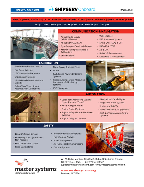 Contact Person-Aleena Johnson Position-Global Sales Head Contact number- +61452643369/+971526935282 Email ID - aleena@mastersystems.com Master Systems Global – is a trusted provider of Marine navigation, communication ,Lsa-Ffa automation, electrical, and calibration solutions. We specialize in the supply, servicing, repair, and certification of onboard systems in accordance with international maritime standards and class society requirements. We remain available for urgent attendances, planned inspections, or spare part supply, and would be glad to send our quotation upon request. 📎 Please find our company brochure attached for your reference. Trusted by the Global Maritime Industry 25 Global Offices Approved by major classes and makers. 500+ Certified Marine Technicians 3500+ Vessels Supported Worldwide Fast coordination and remote support Our global presence in below countries : 1. UAE – Abu Dhabi, Dubai, Sharjah, Fujairah & Ajman 2. Qatar 3. Bahrain 4. Saudi Arabia 5. Singapore 6. India – Mumbai & Cochin 7. Ghana 8. Egypt 9. Oman 10. Namibia-Angola 11. Nigeria 12. Lomé 13. Malaysia 14. Australia 15. Korea 16. Netherlands 17. Spain 18. China 19. Indonesia 20. Australia 21. Turkey We sincerely appreciate your prompt response and assure you that the discussion will not take up much of your time. We look forward to hearing from you and exploring the potential collaboration between our organizations. Thank you for your attention to this matter.