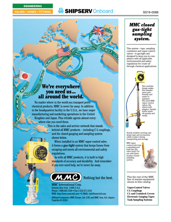 MMC International Corporation manufactures vapor control valves, quick connect coupling flanges, product sampling equipment, and its various product measurement instruments, which meet or exceed the standards for "intrinsically safe" equipment set by national governments and certifying agencies around the world. MMC's primary products include Cam-Lock flanges, tank gauging stations and valves, CL deck covers, cargo UTI measurement devices for closed and restricted application, gas samplers, product samplers and related items for the maritime petroleum and chemical transport industry as well as land-based petro-chemical facilities. MMC is widely acknowledged for its long history of technological innovation, dependability, and quality of its products.