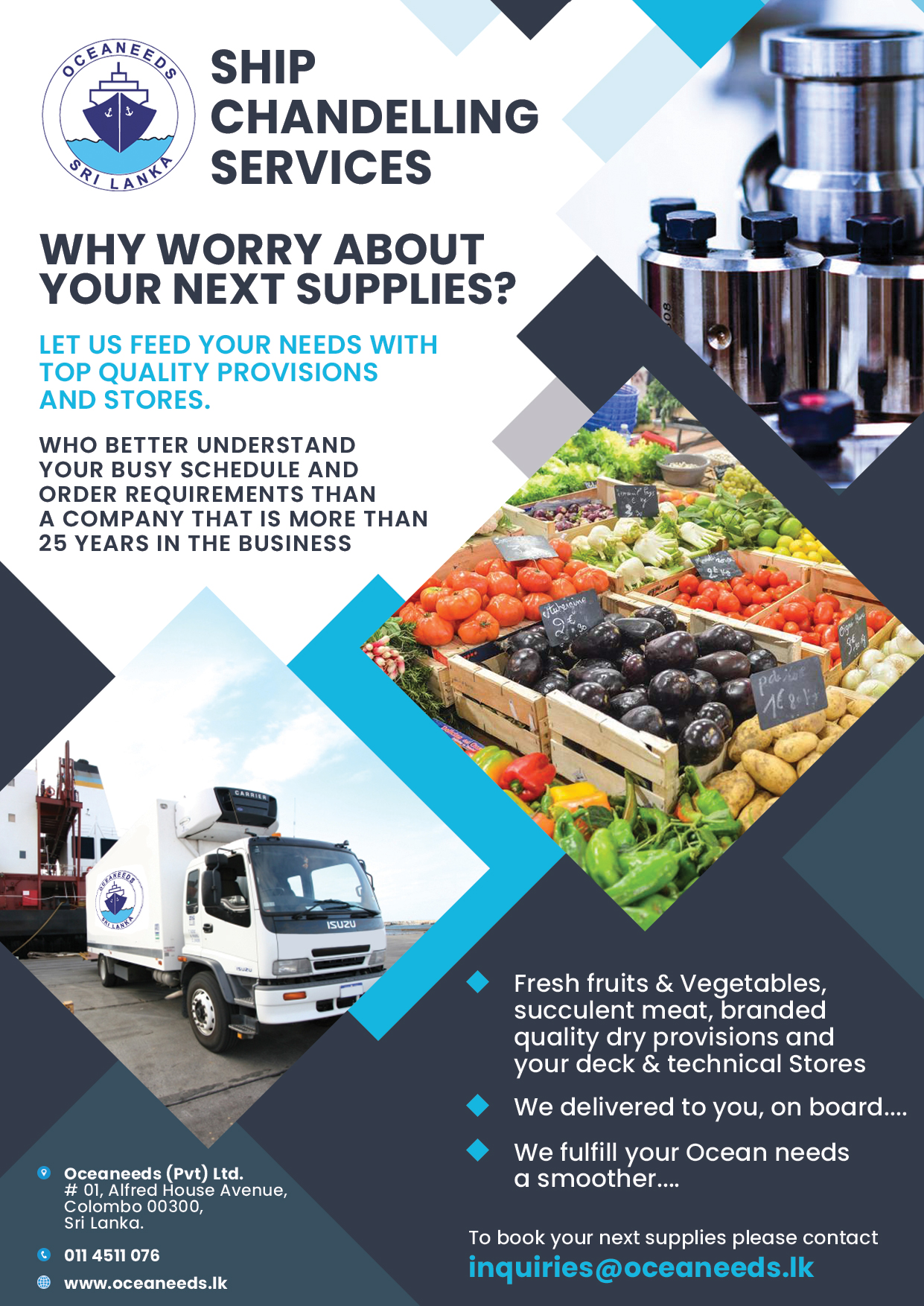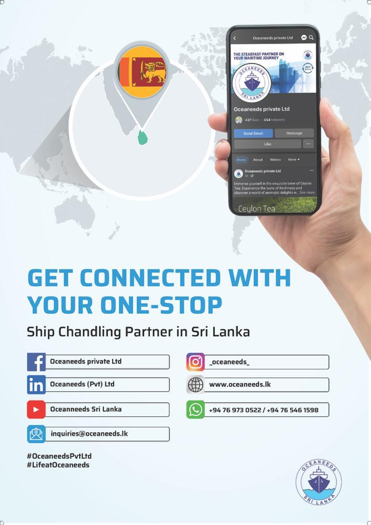 All marine solutions in under one roof. We Oceaneeds (Pvt) was established in 1993 and over the years has become one of the leading Ship Supplies & Agency functions providing company in Sri Lanka to be awarded ISO 9001: 2015 quality certification The certificate was awarded by Det Norske Veritas (DNV) the Norwegian certification body accredited by RVA of Netherlands and it covers the following services. 1. Ship Supplies (Deck / Engine / Provisions/ Bond/ Cabin Items/ Chemical Items/ Medicines / Gases) 2. Agency Services • ship spare/logistics. • Crew Changes + support activities. • Cash to Master. • Supply of fresh water. • Supply of bunkers. • Supply of Interpreters. • Obtaining sanitation certificate and medicine chest certificates. • Arranging medical assistance & disembarkation of crew members in need of medical assistance • Providing tug services. • Own launch Utility boat services. • Coordinating survey activities. • underwater hull cleaning & inspection. • Waste management. • Facilitating Laying-up of ships. • Attending to husbandry matters of vessels which are calling for dry docking & afloat repairs. Less • Bunker Oil • Crew Management Our achievements are a direct result of our emphasis on providing a quality service. Oceaneeds (Pvt) Ltd is also a proud member of the International Ship Suppliers Association (ISSA) and Sri Lanka Ship Suppliers Association (SLSSA)and International Marine Purchasing Association (IMPA) and caters to vessels calling all ports in Sri Lanka (Colombo, Galle, Hambantota and Trincomalee). Oceaneeds (Pvt) Ltd is another proud member of Ceyline Group of Companies – the most diversified shipping group in sri Lanka.