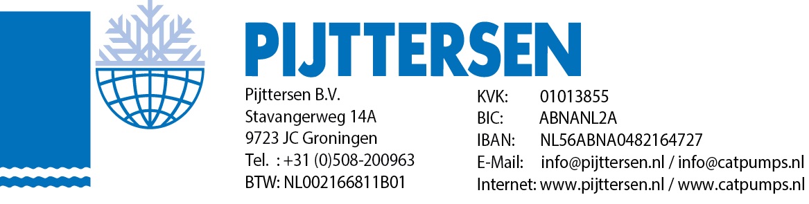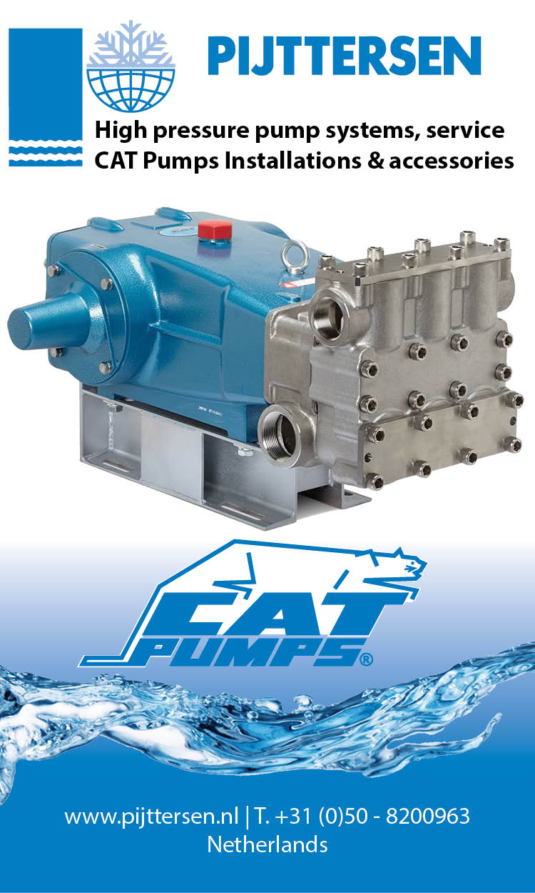 Pijttersen B.V., founded in 1880 in The Netherlands. Authorized distributor of Cat Pumps International since 1978, the well-known blue Cat Pumps high-pressure plunger and piston pumps. We supply high-pressure Cat pumps, high-pressure systems and high-pressure accessories up to operating pressures of up to 690 bar. These pump systems are suitable for various applications, including the food sector, environmental protection, machine construction, paper industry, pharmaceuticals, transport, shipbuilding and car wash. We also supply: - Reverse Osmosis Pumps for Water treatment. - High pressure Spring driven Hose reels, mainly brand TEHA. - Electric Motors, mainly brand Cantoni. - Milk dispenser for cool dairy beverages brand Autonumis. Please check our websites, www.Pijttersen.nl and www.CatPumps.nl for our current services and products. If you cannot find what you are looking for, please do not hesitate to contact us. We do not shy away from a challenge!
