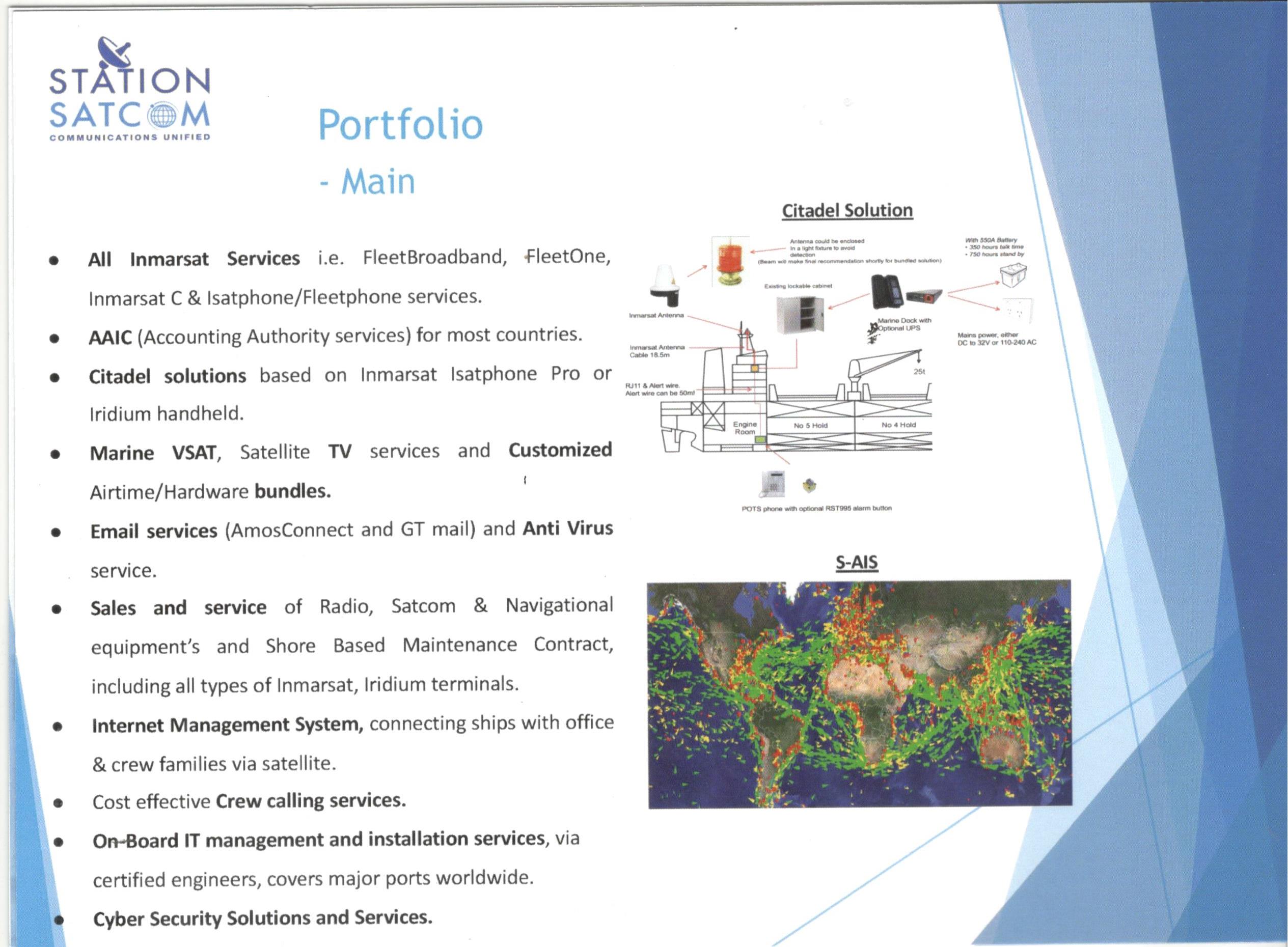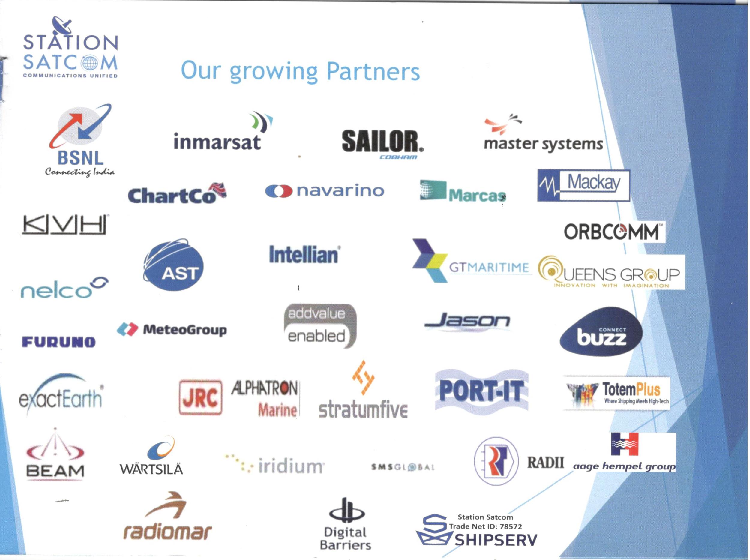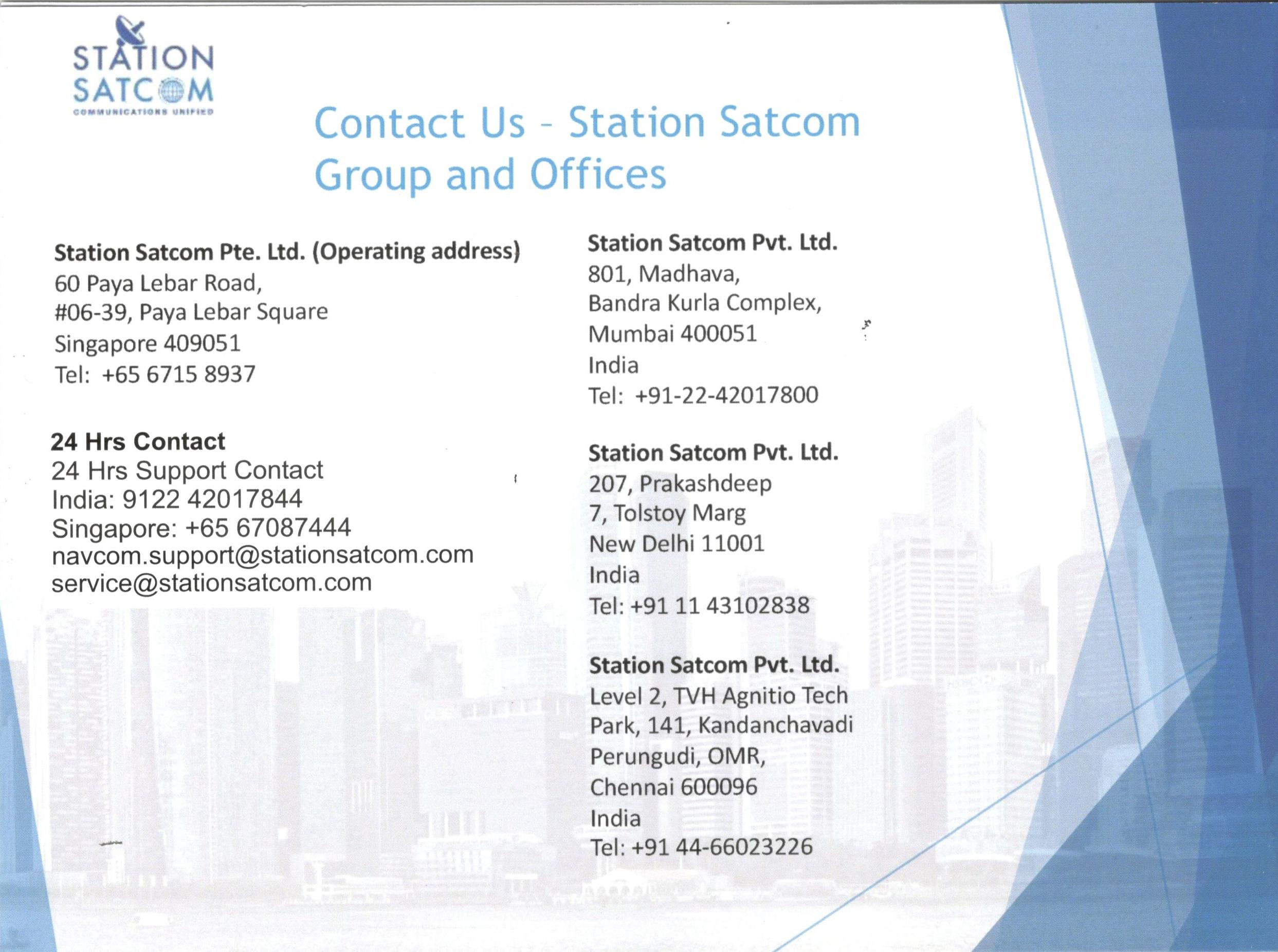 Station Satcom is a: Leading Satellite communications provider since 1998. 40 people strong team, based in offices in India, Singapore, Netherlands, Dubai and Indonesia. One Stop shop for all maritime Navigation and Communication services. Customer base in offshore and maritime, comprising of more than 900 ships. Worldwide network of spares, service and warehousing. Specialized in developing customized need based services and solutions for the Maritime Industry. Our Portfolio is: Global Marine VSAT FleetBroaband (FBB) FleetPhone/ Fleet One BSNL IsatPhone 2 / BGAN 24/7 Navcom Remote Support Repairs / Service of all Equipments Citadel - Safe Room Solutions Inmarsat C (GMDSS) / SSAS / LRIT / AAIC Services CCTV and Video Chat S-AIS Tracking / Weather Routing 4G/5G/LTE - Globbal GSM Service Email / Antivirus / Cyber-Security Solutions Onboard Entertainment - Sat TV Crew Calling cards Lowest Satellite Calling Rates Station Satcom Crew WiFi On-Board IT and Installations New n Refurbished Equipments Iridium G2X Land Vessel IT Solutions HAMS IT Solutions Value Added Services offered: CCTV Solution Movies, Sports, TV News, complete Entertainment packages for Crew. Fuel optimization via Weather Routing Services, Speed Claim Analysis Low costs calling solutions to ships from shore. Data polling and tracking services. Satellite AIS, Sat C Tracking and IDP. Ship Security Alert Systems (SSAS). Pre -LRIT and LRIT testing for most of the flags. ECDIS - ENC's (ChartCo & Transas). Flag change - ownership / management change jobs. Reprograming / radio surveys / VDR APT - COC jobs at worldwide ports. Shore Based Maintenance Contract (SBMC) Supply of Spares and services for all types of Navigation and communication equipment's. Project based jobs to repair/replace critical equipment's' beyond repairs. Navcom + Automation Remote Support: Station Satcom has a team of technical advisers who are having several years of hands on experience and they advise the vessels on the faults reported, remotely. Station Satcom acts as first line support for all ships Navcom faults. Gets advise from experienced advisers instantly. Reduces Technical Superintendents work load. Reduces number of attendances, increases first time fixes. Attending engineer is well informed which reduces expensive technician time by approx. 4-5 hours. Equipment and spares abuse is avoided. Preventive maintenance, results in increase of lifespan of the equipment. Remote Support (TMSA requirement) Results in safe navigation, in compliance with IMO regulations and prevention of detention.