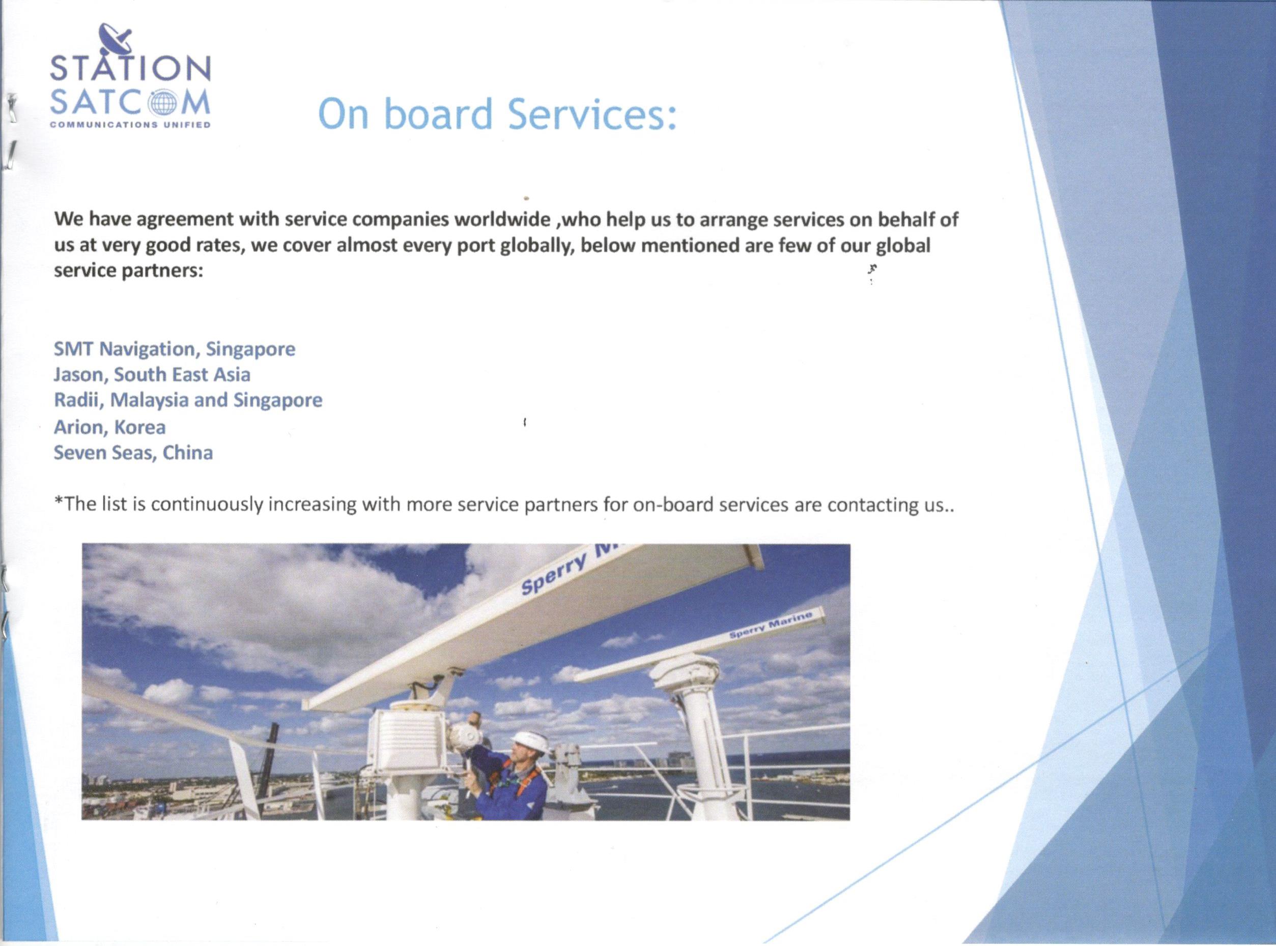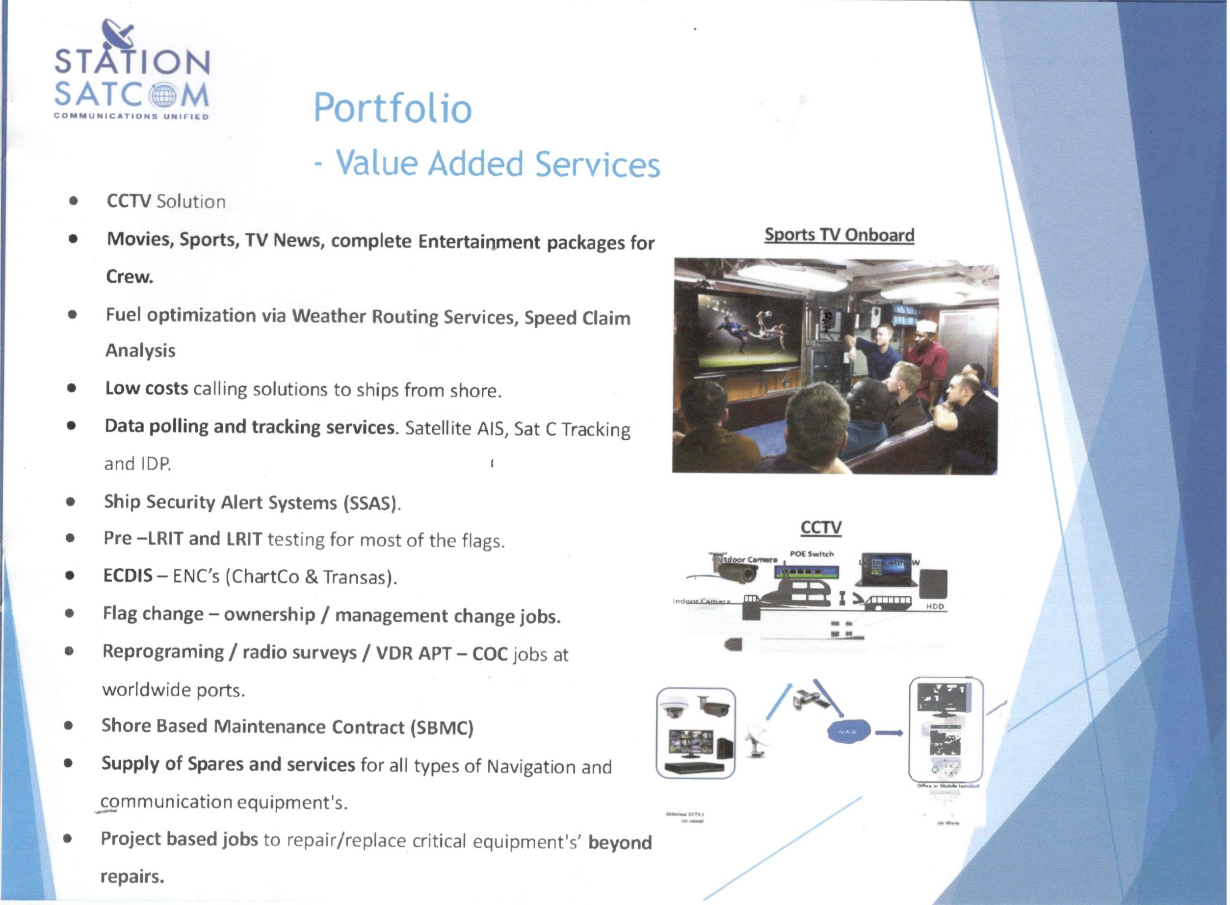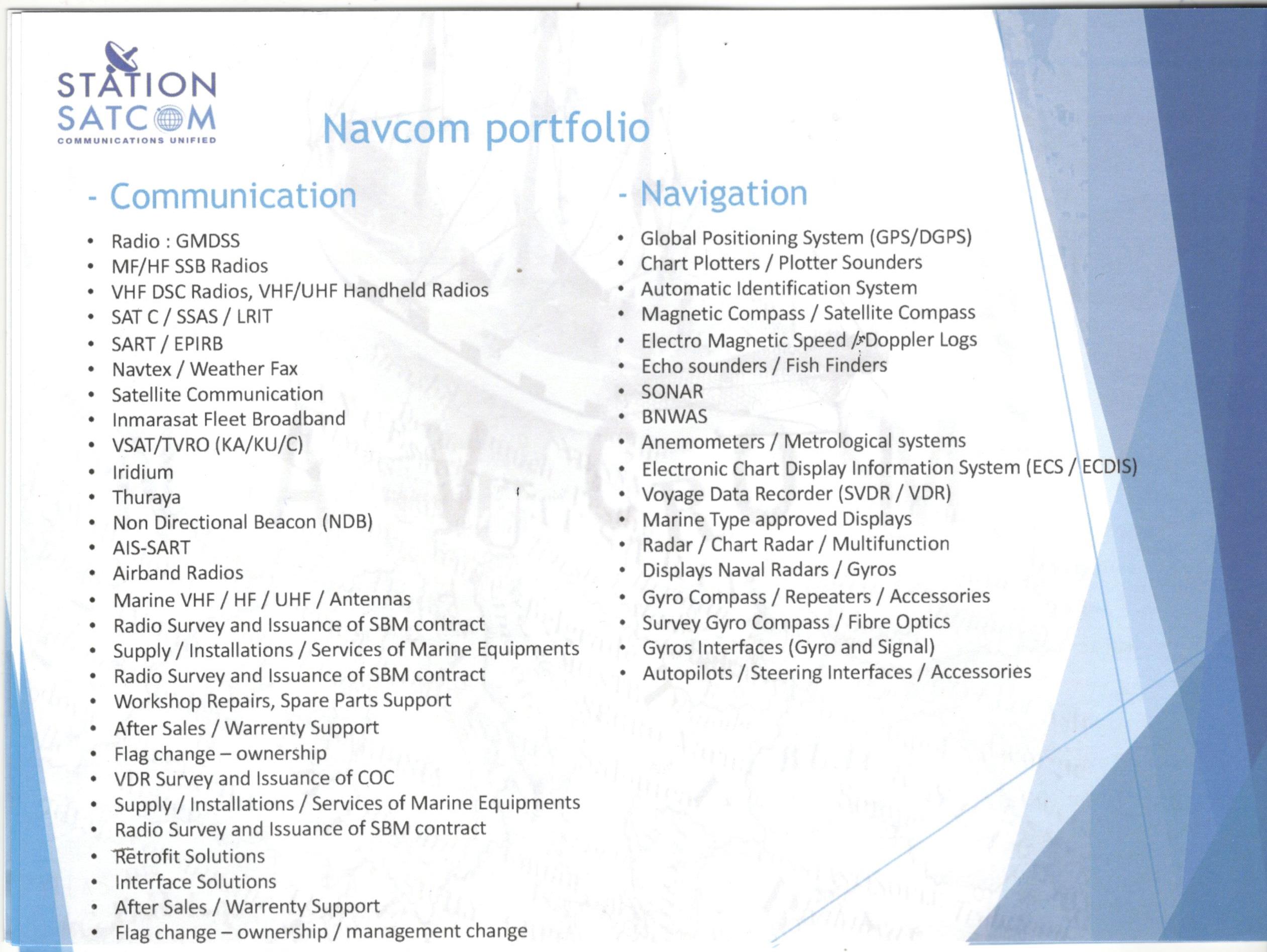 Station Satcom is a: Leading Satellite communications provider since 1998. 40 people strong team, based in offices in India, Singapore, Netherlands, Dubai and Indonesia. One Stop shop for all maritime Navigation and Communication services. Customer base in offshore and maritime, comprising of more than 900 ships. Worldwide network of spares, service and warehousing. Specialized in developing customized need based services and solutions for the Maritime Industry. Our Portfolio is: Global Marine VSAT FleetBroaband (FBB) FleetPhone/ Fleet One BSNL IsatPhone 2 / BGAN 24/7 Navcom Remote Support Repairs / Service of all Equipments Citadel - Safe Room Solutions Inmarsat C (GMDSS) / SSAS / LRIT / AAIC Services CCTV and Video Chat S-AIS Tracking / Weather Routing 4G/5G/LTE - Globbal GSM Service Email / Antivirus / Cyber-Security Solutions Onboard Entertainment - Sat TV Crew Calling cards Lowest Satellite Calling Rates Station Satcom Crew WiFi On-Board IT and Installations New n Refurbished Equipments Iridium G2X Land Vessel IT Solutions HAMS IT Solutions Value Added Services offered: CCTV Solution Movies, Sports, TV News, complete Entertainment packages for Crew. Fuel optimization via Weather Routing Services, Speed Claim Analysis Low costs calling solutions to ships from shore. Data polling and tracking services. Satellite AIS, Sat C Tracking and IDP. Ship Security Alert Systems (SSAS). Pre -LRIT and LRIT testing for most of the flags. ECDIS - ENC's (ChartCo & Transas). Flag change - ownership / management change jobs. Reprograming / radio surveys / VDR APT - COC jobs at worldwide ports. Shore Based Maintenance Contract (SBMC) Supply of Spares and services for all types of Navigation and communication equipment's. Project based jobs to repair/replace critical equipment's' beyond repairs. Navcom + Automation Remote Support: Station Satcom has a team of technical advisers who are having several years of hands on experience and they advise the vessels on the faults reported, remotely. Station Satcom acts as first line support for all ships Navcom faults. Gets advise from experienced advisers instantly. Reduces Technical Superintendents work load. Reduces number of attendances, increases first time fixes. Attending engineer is well informed which reduces expensive technician time by approx. 4-5 hours. Equipment and spares abuse is avoided. Preventive maintenance, results in increase of lifespan of the equipment. Remote Support (TMSA requirement) Results in safe navigation, in compliance with IMO regulations and prevention of detention.