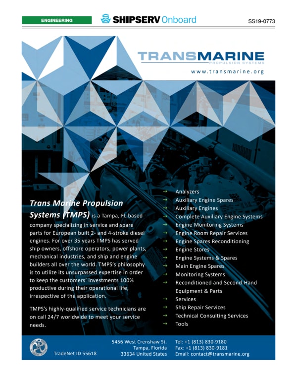 Trans Marine Propulsion Systems (TMPS) is a Tampa, FL based company specializing in service and spare parts for European built -2 and -4 stroke diesel engines. For over 35 years TMPS has served ship owners, offshore operators, power plants, mechanical industries, and ship and engine builders all over the world. TMPS's philosophy is to utilize its unsurpassed expertise in order to keep the customers' investments 100% productive during their operational life, irrespective of the application. TMPS's highly qualified service technicians are on call 24/7 worldwide to meet your service needs.